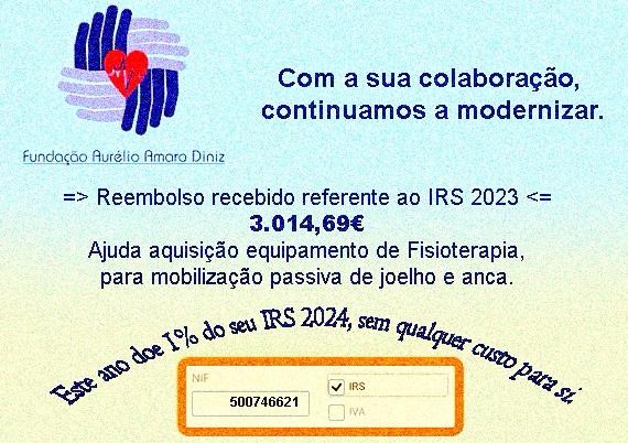 No vosso hospital, o incremento de utilização por parte dos utentes resulta sempre em novos investimentos. Alguns desses investimentos são de difícil rentabilização mas nem por isso deixam de ser clinicamente e socialmente relevantes de estarem aqui disponíveis, o que nos distingue das entidades com fins lucrativos. A esse propósito aproveitamos para lembrar que também podem ser potenciados com a consignação de 1% do IRS a favor da Fundação de Aurélio Amaro Diniz, com o contribuinte n.º 500.746.621. No ano passado, o valor recebido foi de 3.014,69€, que custeou quase a totalidade de mais um equipamento utilizado na fisioterapia de doentes intervencionados com implantação de próteses de anca e de joelho.